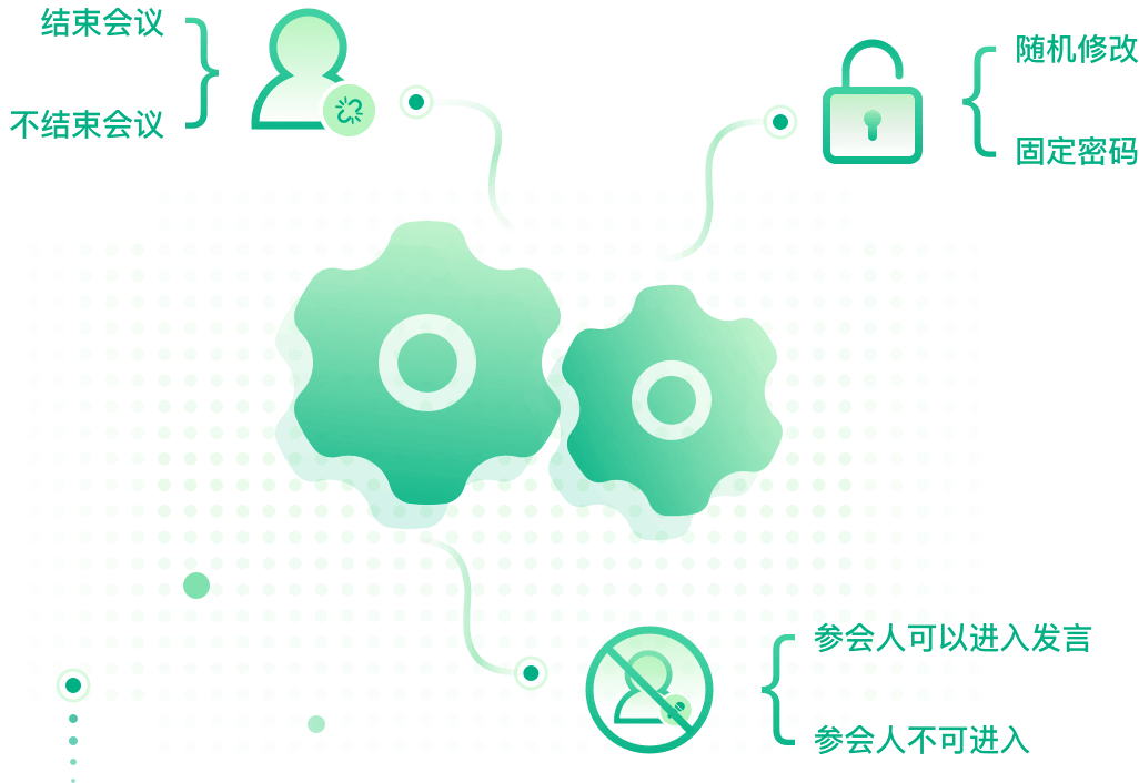 可支持个性化设置各种拓展功能,如密码设置,密码可以随机修改或固定密码;主持人断线可设置结束会议或不结束会议;主持人入会后参会人才能进入;主持人不入会,参会人可以进入发言(或不能发言)等